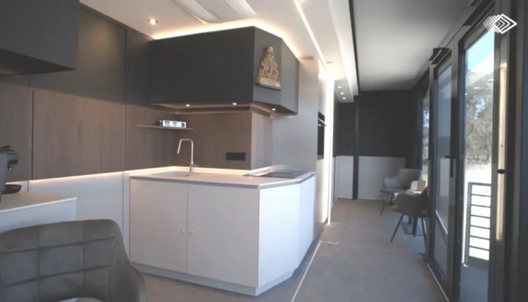The kitchen is built for real cooking, not just heating up cans. You've got an induction cooktop, a decent-sized fridge to keep food and drinks cold for days, a sink for washing up, and lots of cabinets for stashing supplies. Some setups even feature an L-shaped kitchen that wraps to the outside for easy access, great for grilling or prepping without tracking dirt inside.