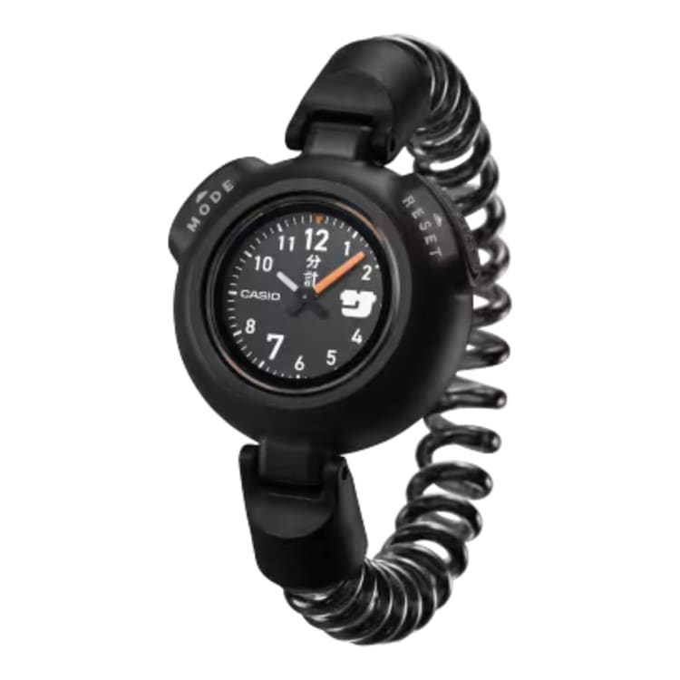 Then there's the strap. Instead of the traditional watch band — or worse, a metal bracelet — the SAN-100H uses a spiral cord strap styled after the kind of coiled bands that used to be attached to gym locker keys. It's an old-school design choice that turns out to be a genuinely smart one. The strap contains no metal, which means it doesn't conduct heat. It won't get scorching hot against the wrist the way a stainless steel bracelet would, and it won't trap moisture the way a standard rubber or leather band might.