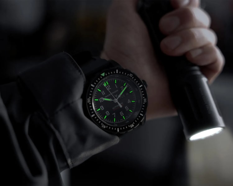 One of the upgrades from the original 2018 Anthracite SAR is the illumination system. All three models now feature upgraded MaraGlo alongside their tritium tubes. Tritium is a gaseous tritium light source — it doesn't need to be charged by light exposure the way traditional lume does. It glows constantly, for years, powered by a low-level radioactive gas sealed inside tiny glass tubes on the hands and dial. Marathon has used tritium for years, and it's one of the reasons military units have trusted them. You can pull a Marathon watch out of a drawer after months in the dark and the hands will still be glowing. The upgraded MaraGlo illumination adds another layer to that legibility, with larger indices that make reading the time even faster under pressure.