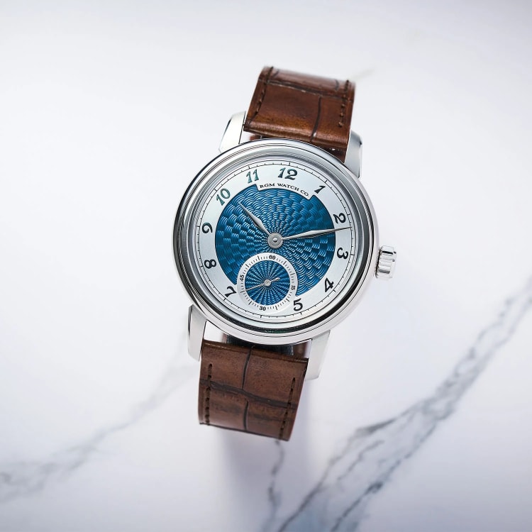 If the case draws you in, the dial makes you stay. RGM built this dial using two different Guilloché patterns—one covering the main section in the center and another on a smaller sub-dial at 6 o'clock. Guilloché is the art of creating intricate, geometric patterns by hand using antique rose engine lathes. It's painstaking work that requires serious skill and machinery that's older than most people reading this.